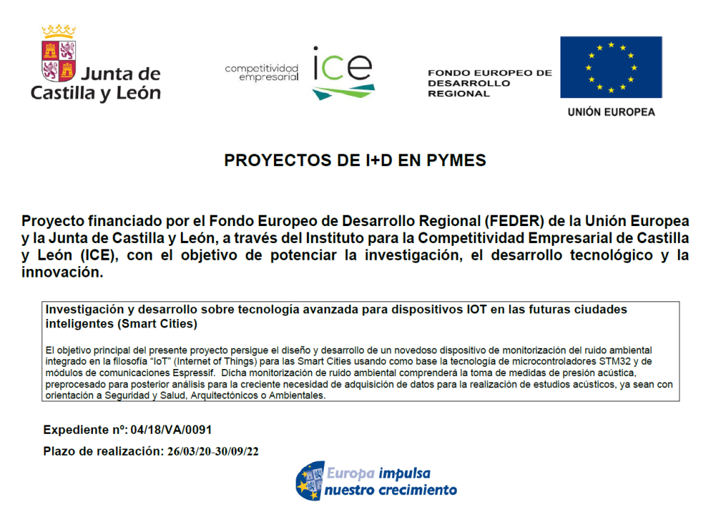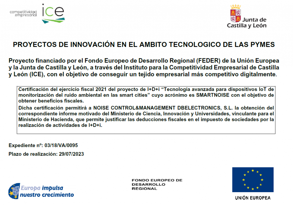 Certificación del ejercicio fiscal 2021 del proyecto de I+D+i “Tecnología avanzada para dispositivos IoT de monitorización del ruido ambiental en las smart cities” cuyo acrónimo es SMARTNOISE con el objetivo de obtener beneficios fiscales.